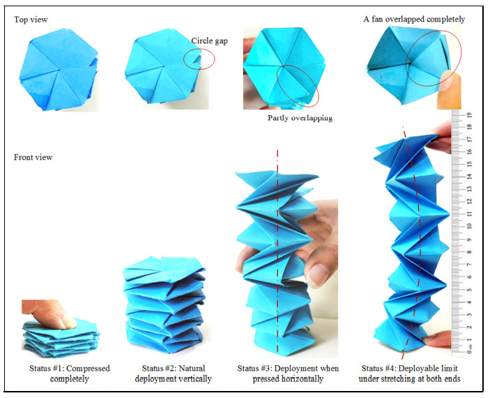 研究人員解釋說:“從俯視圖看,當紙彈簧展開時,彈簧的寬度呈螺旋形收縮,風扇之間的重疊區域增大,直到完全重疊為止。”