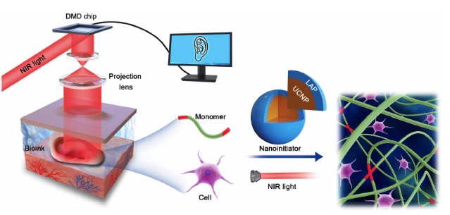 圖1展示了基于DNP的無創3D生物打印示意圖,DMD及時調制NIR光束,隨后將具有光學圖案的NIR光束投射到光學鏡片上,圖案化的NIR光束投過皮膚,誘導皮下注射的含有細胞及納米引發劑的單體溶液空間聚合。通過連續的圖案化NIR光束投影可以將含有細胞的單體溶液在體內無創的打印定制的組織結構。