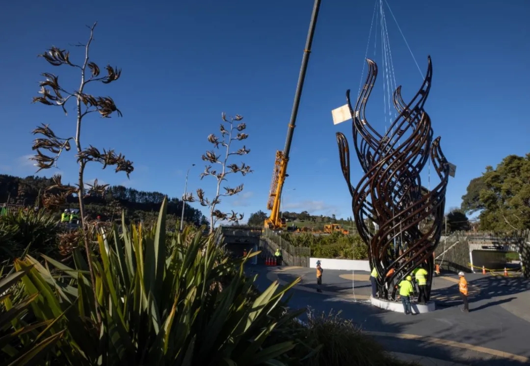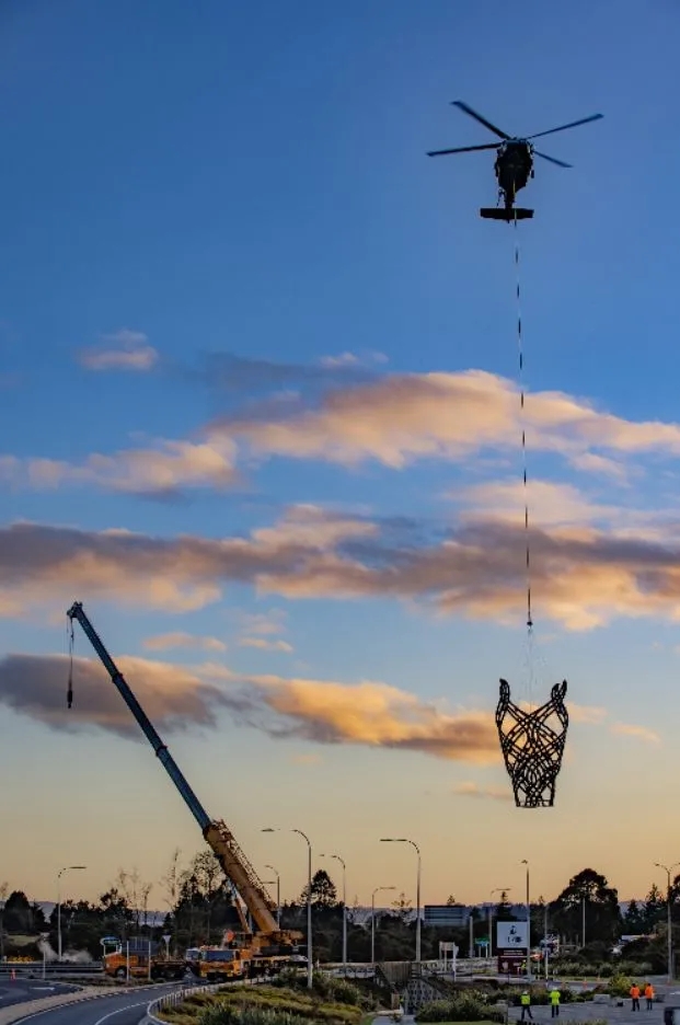 高12米、重3429公斤3D打印雕塑Te Ahi Tupua在新西蘭用直升機吊裝