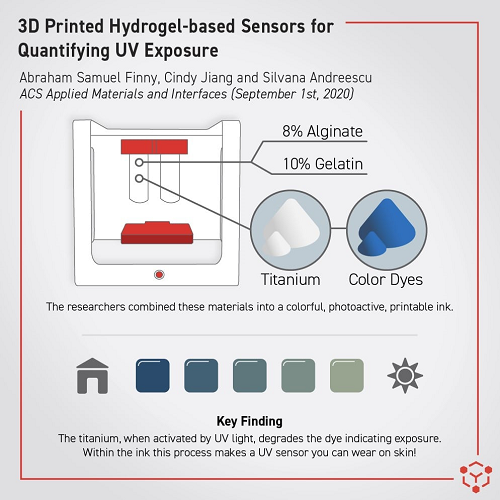 Silvana Andreescu,克拉克森化學與生物分子科學教授兼Egon Matijevic特聘教授以及她實驗室的兩名成員,研究生Abraham Finny和本科生Cindy Jiang,發表了一篇論文,介紹了他們在開發基于水凝膠的3D打印非膠粘劑方面的工作。有毒的傳感器,可以通過指示意外暴露于有害的紫外線中來防止曬傷。