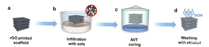 用于通過滲透3D rGO支架(a,b),用堿性蒸氣膠凝(c)和乙醇洗滌(d)來制造二氧化硅(或SiAl)/ rGO雜化物的合成過程示意圖。圖片來自《歐洲陶瓷學會雜志》。