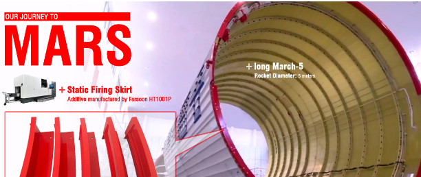 中國(guó)邁出了對(duì)太陽(yáng)系進(jìn)行行星探索的第一步,于2020年7月23日向火星派出了一支長(zhǎng)征5火箭。這不僅是其首款從頭開(kāi)始專門(mén)針對(duì)非超液體火箭的運(yùn)載火箭推進(jìn)劑,但它也包含增材制造零件。當(dāng)?shù)?D打印系統(tǒng)供應(yīng)商Farsoon Technologies使用激光燒結(jié)平臺(tái)和高性能聚合物粉末材料為火箭的靜態(tài)射擊裙生產(chǎn)了50個(gè)零件,該零件在平臺(tái)和后支撐環(huán)之間提供了臨時(shí)結(jié)構(gòu)介質(zhì),以保護(hù)解鎖裝置。機(jī)器的連續(xù)運(yùn)行有助于提高高質(zhì)量的功能性最終靜電點(diǎn)火裙的生產(chǎn)速度并降低制造成本,該裙邊由50個(gè)單獨(dú)的3D打印件組成,每個(gè)件的尺寸為370 x 100 x 125 mm,并且僅用48小時(shí)即可完成生產(chǎn),由Farsoon撰寫(xiě)。組裝后,這些零件就構(gòu)成了直徑為5,000毫米的圓柱結(jié)構(gòu)。
