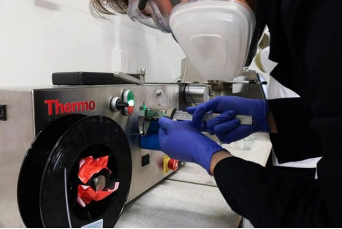 這位學(xué)生從當(dāng)?shù)刭O貝養(yǎng)殖場(chǎng)收集了包括漁網(wǎng)、浮標(biāo)在內(nèi)的總共40公斤各種廢物,整個(gè)處理過(guò)程非常簡(jiǎn)單,首先除去塑料表面的泥土等污染,然后將塑料垃圾放入工業(yè)烤箱加熱融化,等冷卻后將其切成顆粒,最后把這些顆粒放入絲材擠出機(jī)后就可以用來(lái)進(jìn)行3D打印操作了。