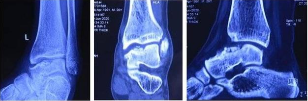 患者,男,28歲,左踝關(guān)節(jié)疼痛1年,加重3個(gè)月,影像學(xué)表現(xiàn)為左距骨內(nèi)髁壞死、塌陷,面積約3*2cm大小。距骨壞死的治療,對(duì)直徑在2cm以內(nèi)的距骨壞死,可以采用自體股骨髁骨軟骨移植、自體帶骨膜髂骨移植等方法,但對(duì)于直徑超過2cm的距骨壞死,尤其是年輕患者,一直是治療的難點(diǎn)。搜索國(guó)內(nèi)外文獻(xiàn),對(duì)于超過2cm距骨壞死,一般采用踝關(guān)節(jié)融合、踝關(guān)節(jié)置換、同種異體距骨移植、全距骨置換等方法。但上述方法均有弊端:采用關(guān)節(jié)融合,患者喪失踝關(guān)節(jié)功能;踝關(guān)節(jié)置換、全距骨置換對(duì)于年輕、距骨單髁壞死患者,創(chuàng)傷大,且需要多次的返修手術(shù);國(guó)外有采用同種異體新鮮距骨移植的報(bào)道,但目前國(guó)內(nèi)還沒有相關(guān)的骨組織工程庫(kù)。經(jīng)手術(shù)團(tuán)隊(duì)術(shù)前充分討論,認(rèn)為3D打印技術(shù)因其個(gè)性化的設(shè)計(jì)已經(jīng)越來越多地應(yīng)用于臨床,決定對(duì)患者行3D打印距骨部分置換手術(shù)。