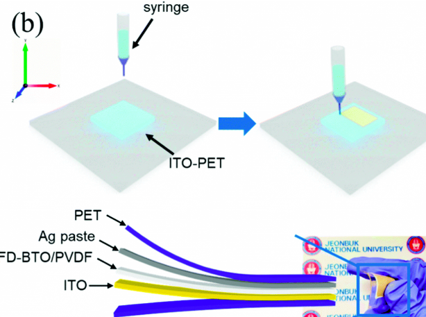 一旦研究人員確定了最佳的PVDF-BTO配方,他們便部署了Musashi Engineering機械臂式3D打印機,將材料分配到膠片中。然后,在使用鎳帶標記其電極之前,將銀漿印刷在設(shè)備的表面上,并在電場下對其進行極化處理。