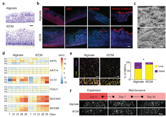 Wagner(音譯:瓦格納)和她的團隊首先將海藻的藻酸鹽與肺組織的細胞外基質結合起來,形成了生物墨水。然后將生物墨水中載有在人氣道中發現的干細胞,并進行3D打印以形成模仿這些氣道的復雜且機械穩定的組織構造。瓦格納說:“我們從制造小管開始,從小做起,因為這是氣道和肺血管中都存在的特征。通過將我們的新型生物墨水與從患者氣道分離的干細胞一起使用,我們能夠對具有多層細胞并隨時間保持開放的小氣道進行生物打印。”