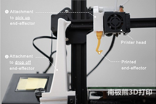 該系統基于Creality公司的CR-103D打印機運行,在噴頭一側增加了裝置,用于安裝和切換3D打印出來的操作器,在機器側面有加裝的儲藏器,用于放置暫時不用的操作器。打印機依賴一個倒鉤來切換操作器,倒鉤通過按壓操作器并將其卡扣到位而連接成功。工具安裝完畢后就可以用來移動面板上的各種3D打印對象并用于完成任務。操作器的功能包括用于分離支撐、折疊打印部件或移動部件的專用掛鉤。