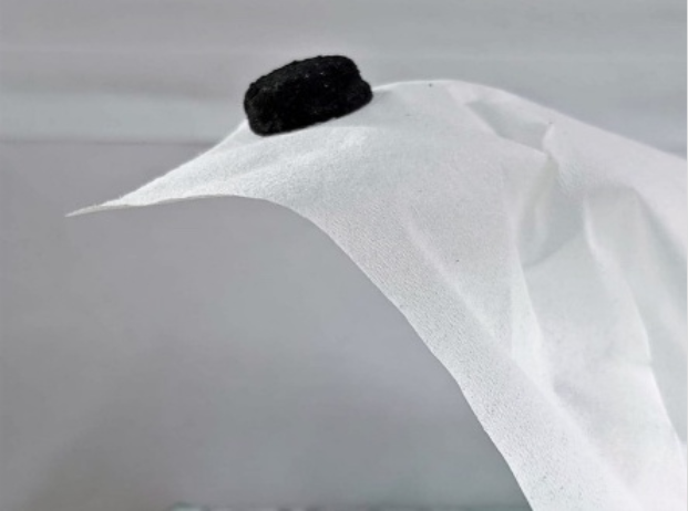 科學(xué)家在Kim擦布上3D打印超輕G-PDA-BSA氣凝膠。圖片來自布法羅大學(xué)。