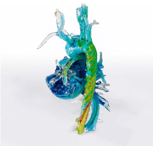 為了進一步評估患者心臟的血液流動情況,Mitchell醫(yī)生的研究團隊進行了4D核磁共振血液流動分析。這使得調查員能夠描繪出血液經過心臟進入血管的流動情況。由于患者主動脈的流出方向很不尋常,Mitchell醫(yī)生認為其血液流經心室進入主動脈的血流情況高度異常,并且很可能效率低下。這一觀點得到了證實,Mitchell醫(yī)生要求在手術前使用多材料3D打印心臟模型,以演示異常的血液流動路徑(圖 3a)。