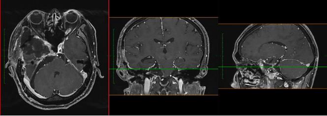 更難的是,這個腫瘤的位置也很“刁鉆”,橫跨了中顱窩和后顱窩兩個不同的區域。如果我們把大腦看成一座兩層樓的房子,那就意味著,小成的腫瘤從二樓沿梯而下,一直蔓延到了一樓。