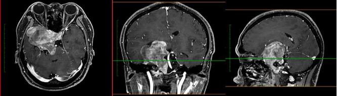 當地醫院對小成頭顱進行MRI檢查,提示:鞍區、中顱窩及后顱窩巨大占位,腦干受壓明顯,且部分已侵襲突破顱底骨質,腫瘤大小約8.2*7.3*5.8cm,此外,電子視野檢查發現右眼鼻側視野、左眼顳側視野嚴重缺損。
