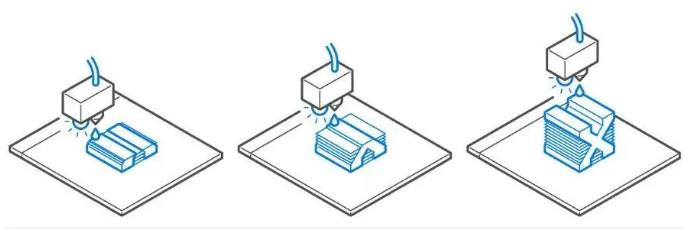 材料噴射是一種 3D 打印工藝,其中微小的材料液滴被沉積,然后在構建板上固化或固化。使用暴露在光線下會固化的光敏聚合物或蠟滴,一次一層地構建物體。材料噴射過程的性質(zhì)允許在同一物體上打印不同的材料。這種技術的一個應用是制造多種顏色和紋理的零件。