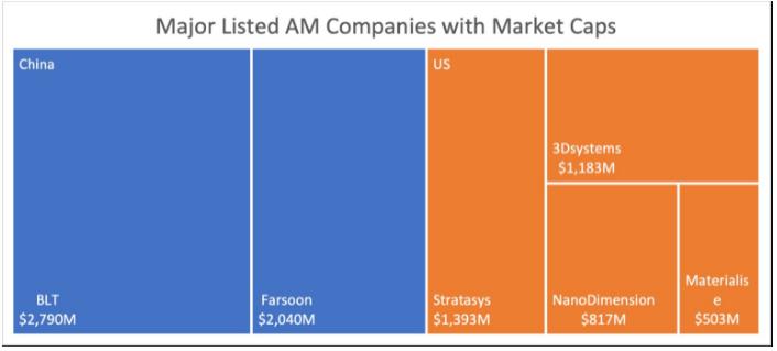 多家中國增材制造企業取得了驕人的業績并成功上市,受到了投資者的廣泛關注。值得注意的是,西安鉑力特激光技術有限公司(BLT)作為市場領導者脫穎而出,尤其是在金屬3D打印領域。BLT在上海證券交易所(688333.SS)的上市受到熱烈歡迎,其市值已超過3D Systems、Stratasys等國際知名企業。BLT 的成功主要是由于金屬增材制造在關鍵行業中日益普及。有數據統計表明,鉑力特70%以上的設備用于航空航天制造。