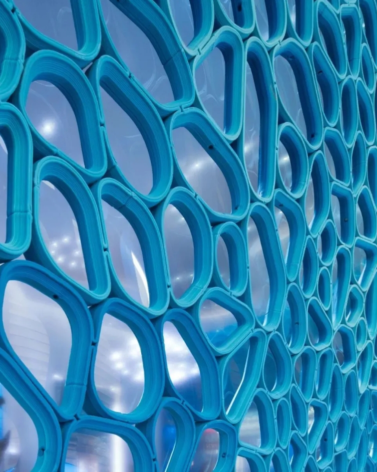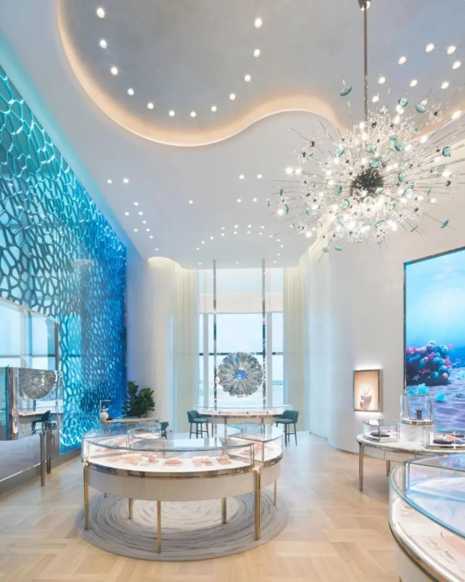 受錯(cuò)綜復(fù)雜的珊瑚構(gòu)造的啟發(fā),讓游客感覺自己身處“海底”,立體結(jié)構(gòu)由3D打印技術(shù)和回收材料制成。這種新型建筑材料采用回收的漁網(wǎng)和回收的海洋塑料制成,展示了蒂芙尼向“保護(hù)環(huán)境”邁出的一步。